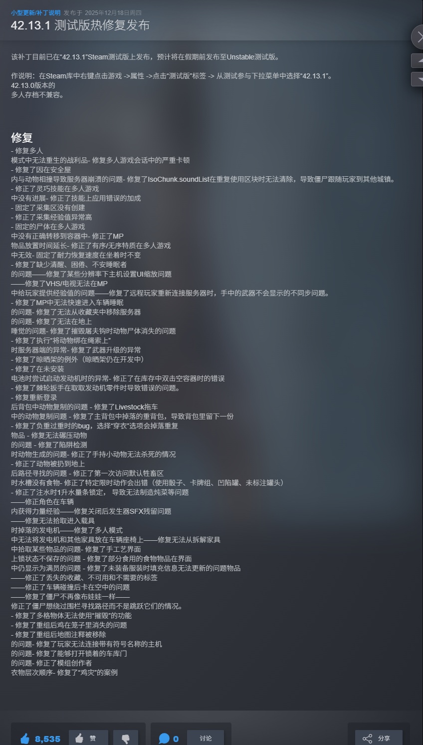 5. 持续更新:v42.13.1 新增 Louisville 扩展区、双持武器、改进车辆物理与手柄支持,中文文本 100% 覆盖。