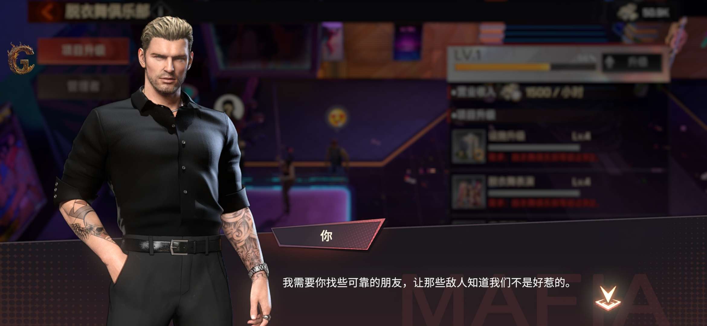 2.策略经营:酒吧、赌场、地下拳场自由建造,实时调控资源产出与防御布局。