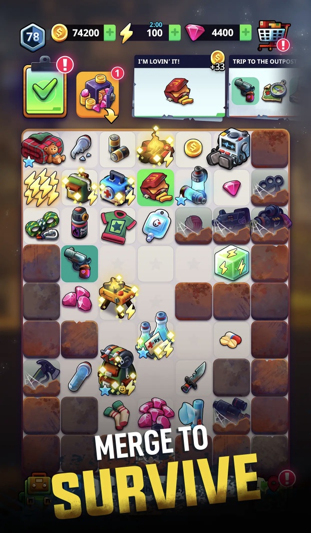 《合并生存 Merge Survival》是一款将合成玩法与末日生存完美结合的海外热门手游。玩家置身于资源匮乏的废土世界,通过拖拽合并木材、石块、金属等基础物资,逐级解锁武器、防具、医疗包乃至高科技设施,在丧尸与恶劣气候的双重威胁下建立安全避难所,并探索未知区域寻找幸存者。游戏节奏轻松却极具策略深度,每次合并都可能决定你能否撑过下一波黑夜。