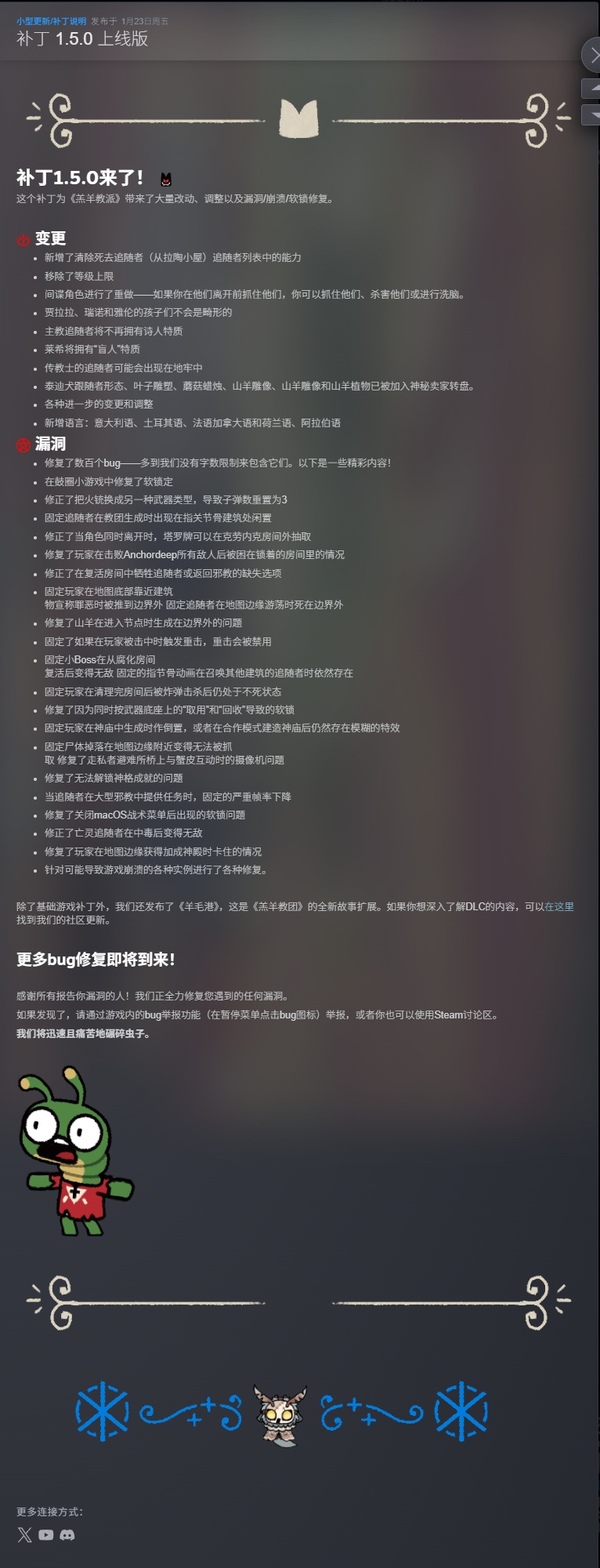 4. 存档位于C:\Users\你的用户名\AppData\LocalLow\Massive Monster\Cult of the Lamb,建议定期备份。