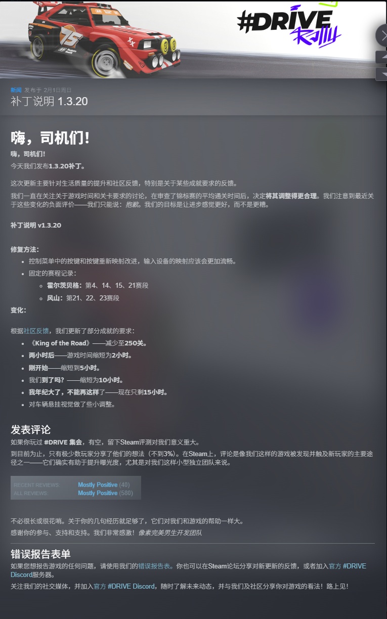 首次运行请在设置中开启“手柄震动”以体验路感;存档位于C:\Users\你的用户名\AppData\Local\DriveRally,重装系统前请备份;联机模式需保持游戏版本一致,建议关闭自动更新功能。