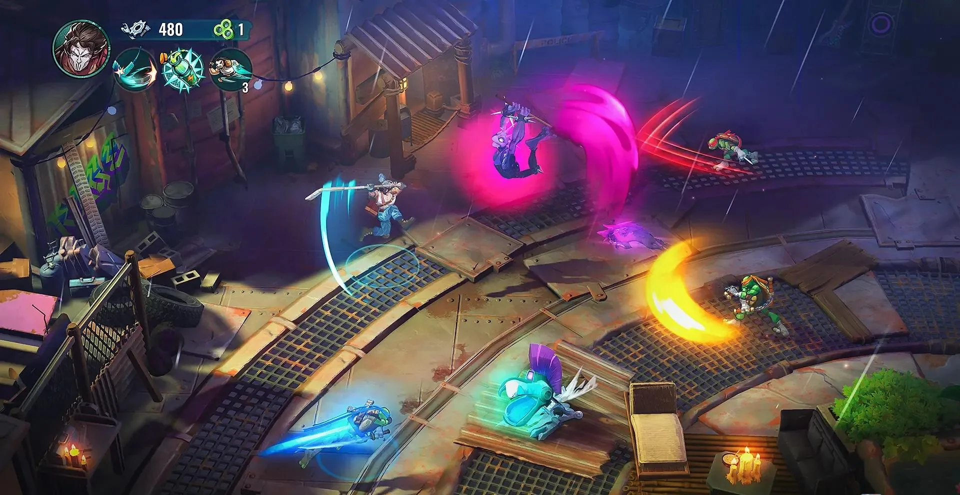 • 四龟无缝切换:莱昂纳多、拉斐尔、米开朗基罗、多纳泰罗拥有独立连招与技能树,可单骑闯关也可组队配合