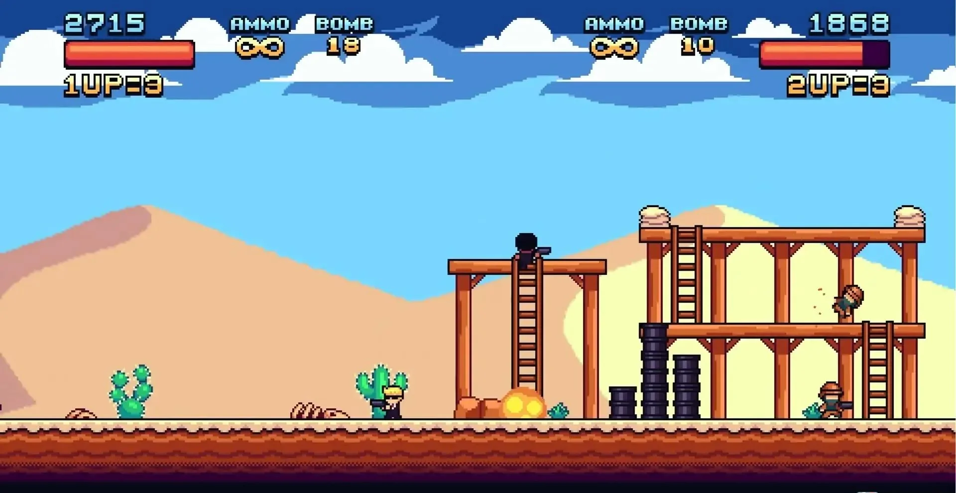 1. 经典横版射击+潜入要素,可任意方向开火、投掷手榴弹或引爆油桶制造连锁杀伤。
