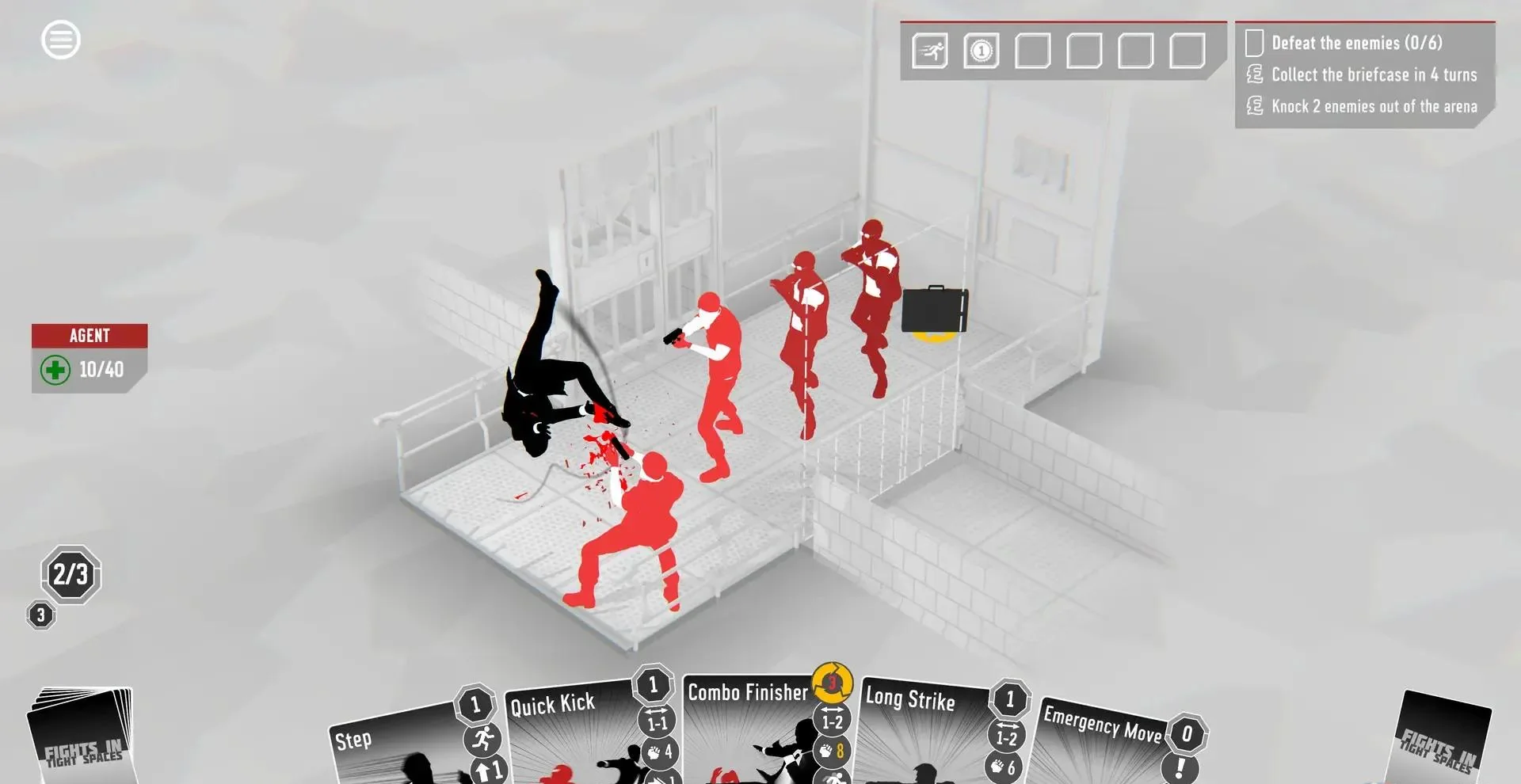 《狭间战斗 Fights In Tight Spaces》是一款融合卡牌构筑与回合制策略的独立动作游戏,由Ground Shatter开发,Mode 7发行。玩家化身十一区顶级特工,在走廊、电梯、车厢等狭窄场景中,用卡牌打出如电影分镜般流畅的连招,击败全球犯罪组织。游戏将战棋走位、卡牌连携与环境互动完美结合,每一次出手都需要计算距离、动量与反击时机,带来硬核又爽快的战术体验。