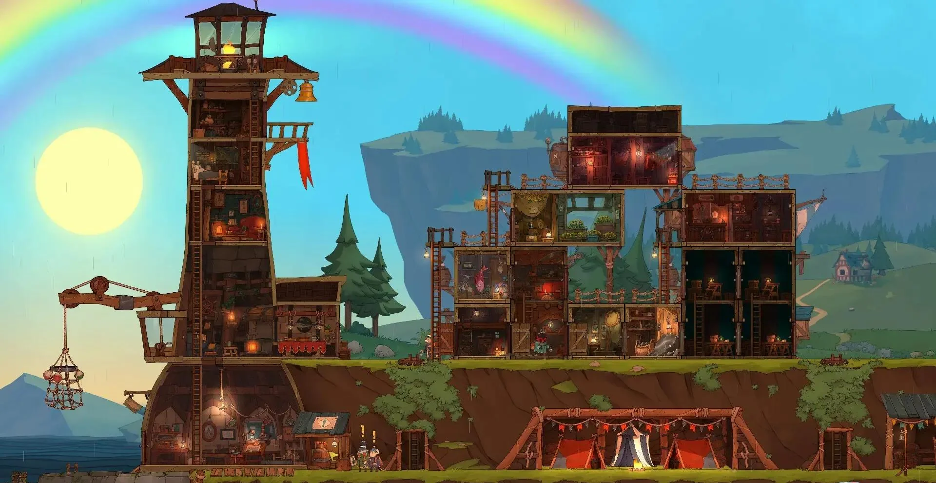 3. 三栖建造系统:栈道、高塔、空岛自由布局,利用水位变化打造立体城镇。