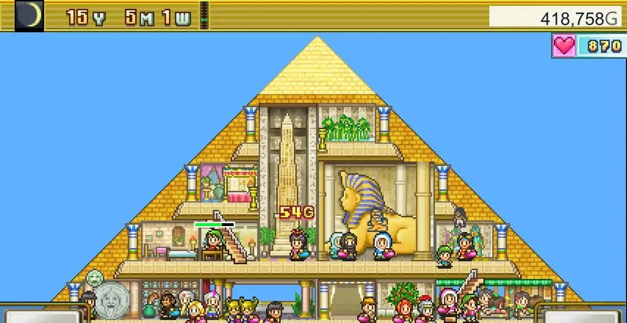 2. 立体建造系统:纵向扩建金字塔楼层,店铺、壁画、花坛、陷阱自由搭配,触发相邻加成。