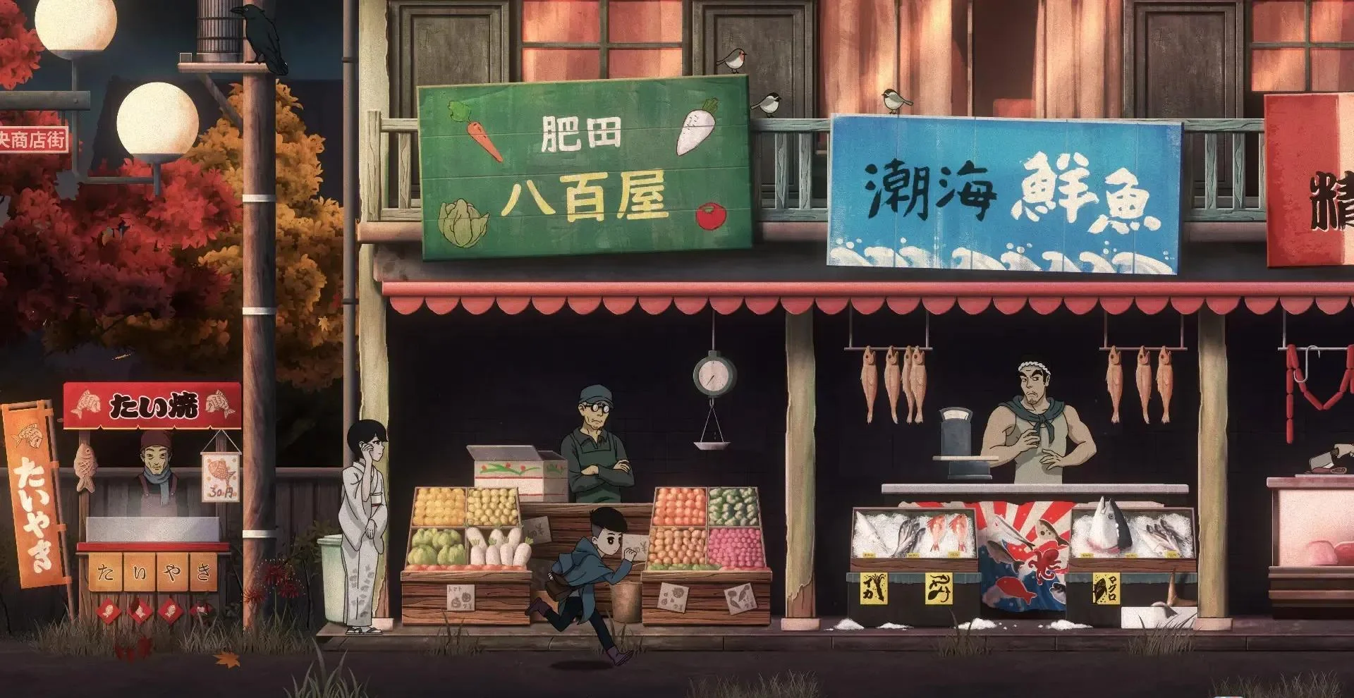 1. 传统手绘动画:逐帧日式赛璐璐风格,还原80年代怀旧街景与神话生物。