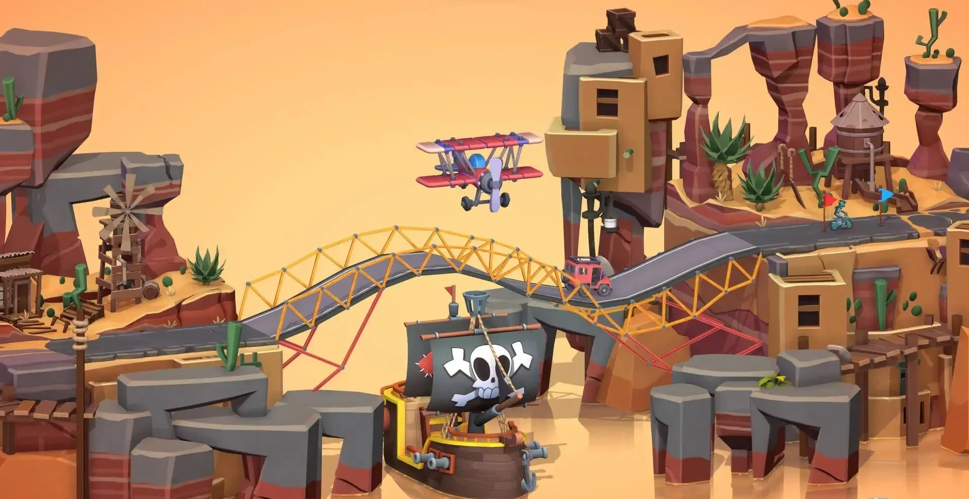 《Poly Bridge 3》是Dry Cactus旗下桥梁建造模拟系列的第三部正统续作,官方中文v1.5.5版带来更开放的沙盒世界与百馀关卡。玩家化身桥梁工程师,在物理规则下利用木材、钢材、绳索、液压等素材搭建桥梁,让汽车、卡车甚至热气球安全过河。战役模式采用开放世界结构,穹顶塔楼、彩虹拱桥等主题场景极具视觉冲击;沙盒模式支持自定义关卡与创意工坊分享,全球玩家实时比拼造价与创意,欢乐翻倍。