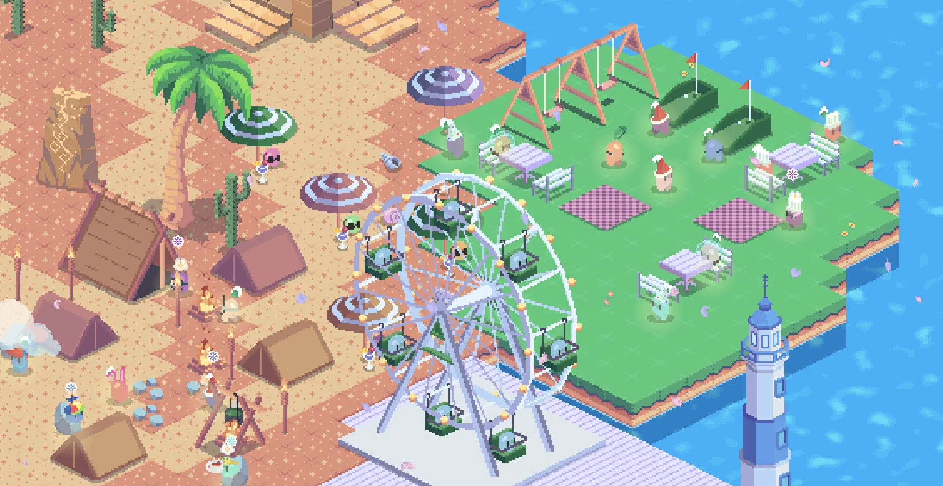 《Gourdlets》又名《大头小岛》,是一款由独立团队打造的治愈系沙盒建造游戏。玩家将化身海岛规划师,迎接搭乘小火车到来的“小葫芦”居民,在绿意盎然的岛屿上自由摆放建筑、装饰与家具,打造专属蔬菜小镇。没有任务压力,无需资源争夺,小葫芦们会自主钓鱼、阅读、露营、打盹,用最松弛的姿态陪你一起慢生活。
