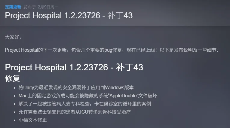 《Project Hospital》医院计划是一款由捷克独立团队打造的硬核医院模拟经营游戏。玩家将同时扮演院长、建筑师与主治医师,从地基规划到科室布局,从招聘医护到疑难杂症手术,全流程体验真实医疗体系。v1.2.23726中文版已集成全DLC,支持官方中文界面与病历文本,200MB轻量体积却拥有超千种病症、百种医疗器械与模块化建造系统,解压即玩,零门槛开启白色巨塔之梦。