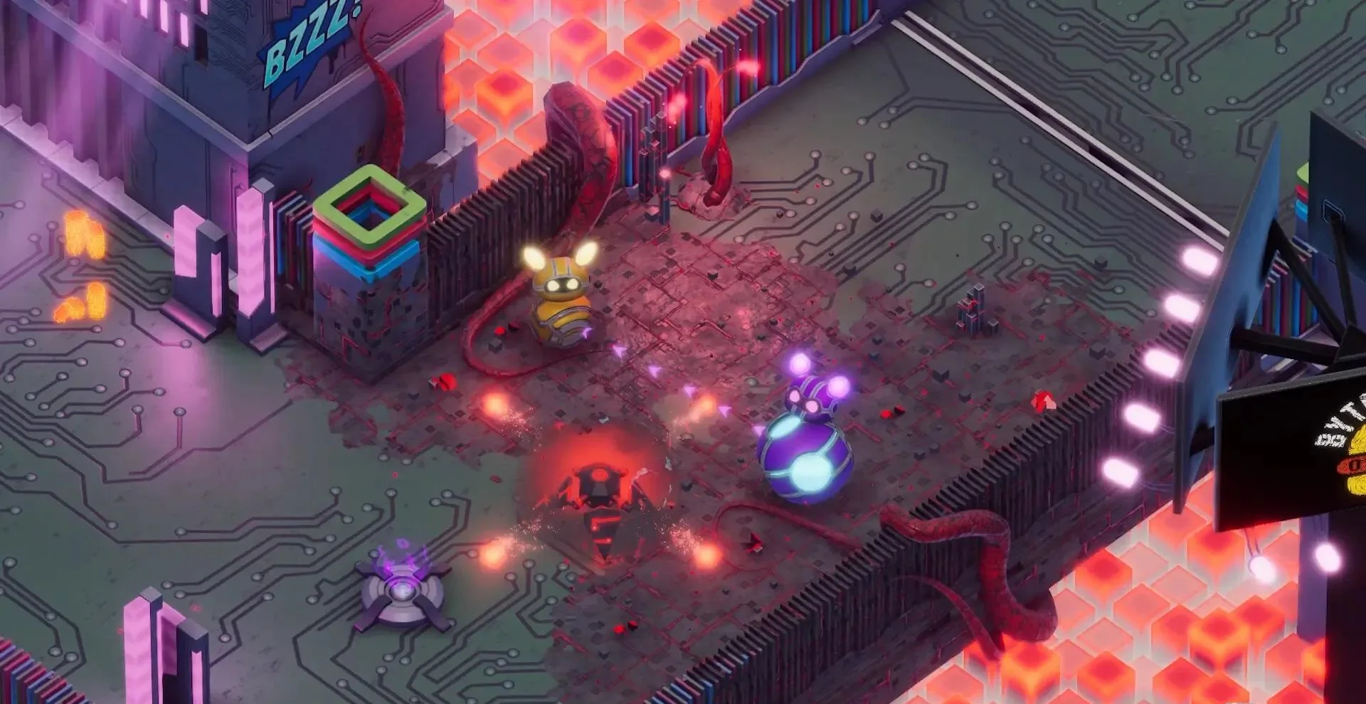 2. 萌系赛博美学:机器人碰撞Q弹变形,击杀病毒爆出炫彩像素粒子。