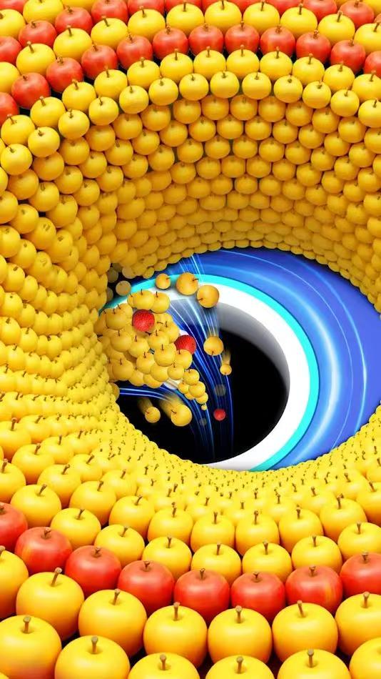 2. 升级进化:吞噬获得经验,黑洞体积实时增大,从小苹果到摩天大楼,吞噬范围无上限。